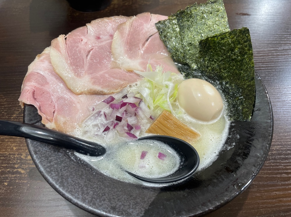 白ネギと紫ネギの2種類がトッピングされており、この違った味わいと食感がとても良いアクセントになっています。